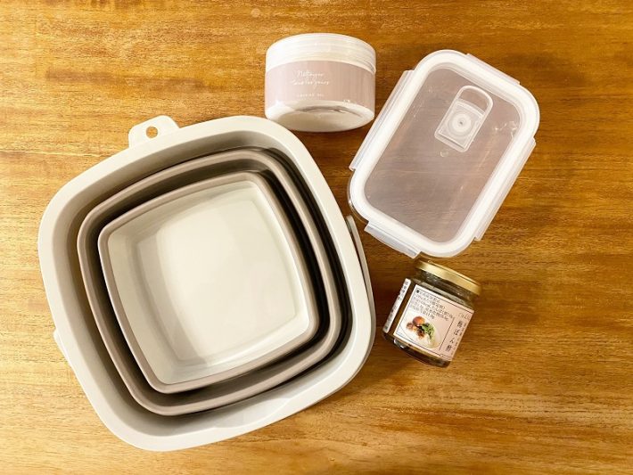 今回は左下の「折りたためるバケツ」(550円)と、右下の「食べる梅ぽん酢」(440円)を紹介