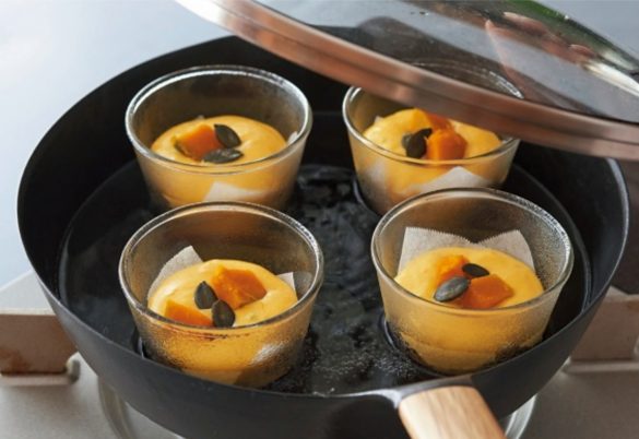 4. フライパンに水を2㎝深さまで入れて火にかける。沸いたら3を並べ、蓋をして12~15分蒸す。串を刺して生地がついてこなければ、型のまま網に並べて冷ます。