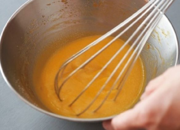2. 別のボウルにBのかぼちゃを入れてフォークでつぶし、てんさい糖を加えて混ぜる。残りのBを加えて泡立て器でなめらかに混ぜる。