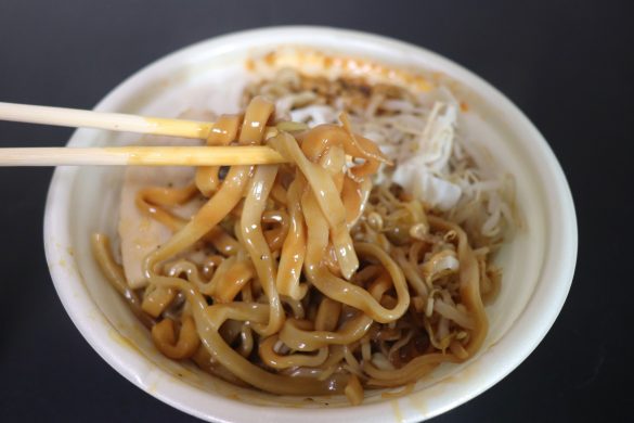 とにかくこの商品は麺が太い。これまでセブンイレブンはもちろん、コンビニ各社のジェネリック二郎を食べてきましたが、その中でも恐らく一番麺が太いです。噛み応えが十分すぎてあごが疲れるほど。