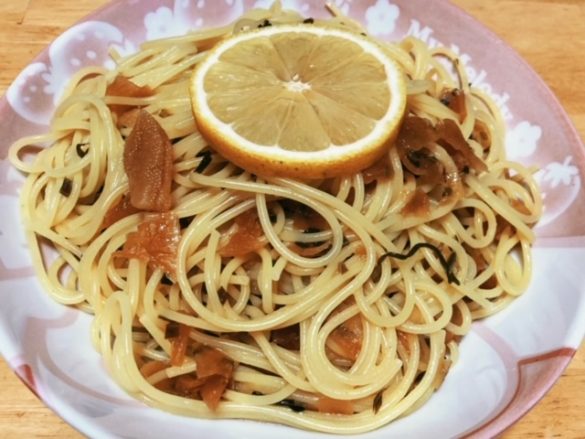 それは、ボウルに茹でたパスタと松前漬け適量とバターを入れてよく和えて、お皿に盛り付けて、レモンをギュッと絞るだけというシンプルなものでした。
