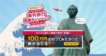 これは、全5問のクイズに答えて応募するだけで、抽選で「行ってみたかった100万円の海外旅行」をする権利が当たるというもの。クイズのヒントは、なぜか坂本龍馬がマンガで教えてくれるので楽勝~。旅行先も日程も選べるので、”当たったけど日にちが合わない”なんていう心配もありませんね。