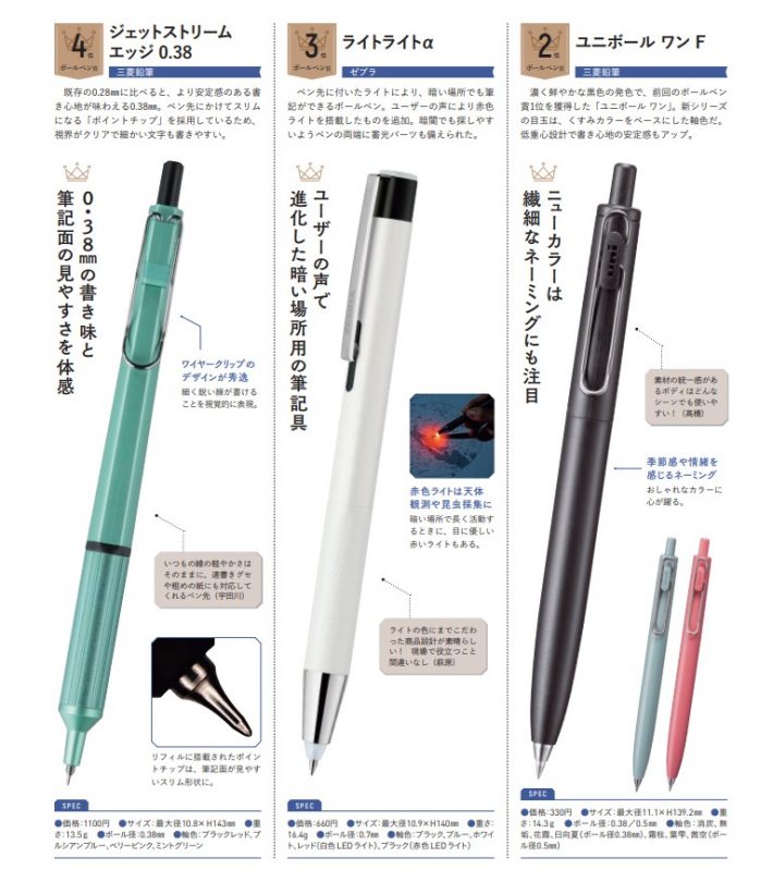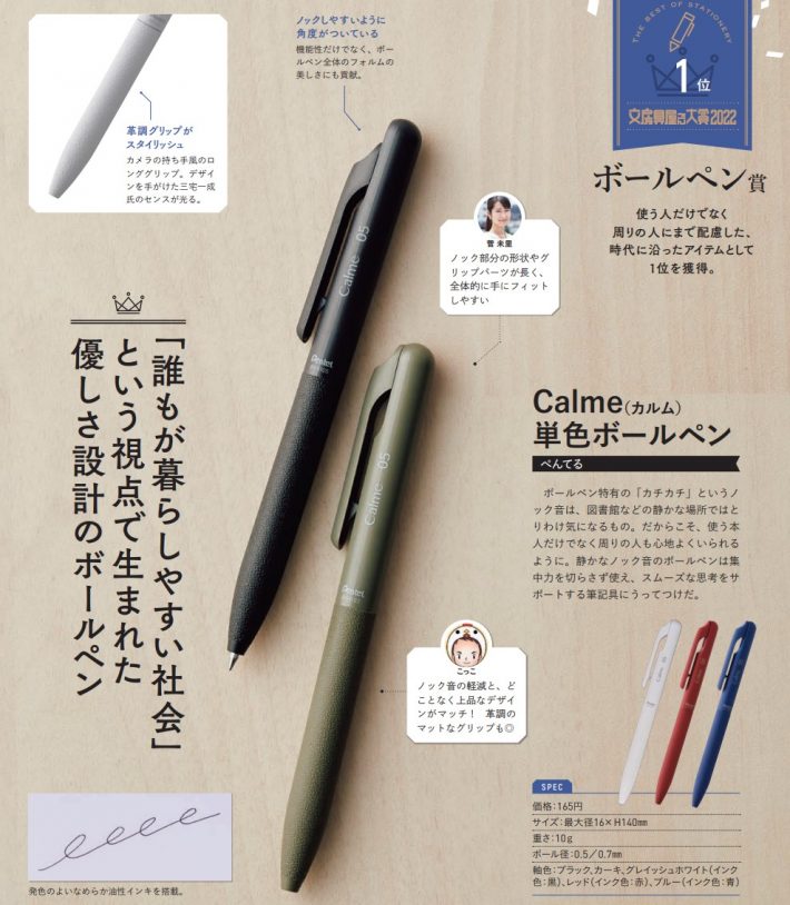 使う人だけでなく周りの人にまで配慮した、時代に沿ったアイテムとしてボールペン賞の1位を獲得。「誰もが暮らしやすい社会」という視点で生まれた優しさ設計のボールペンです。