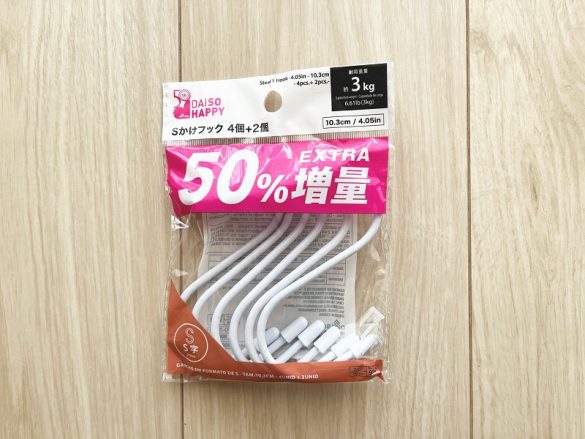 ウォークインクローゼットの中でバッグをかけるために使っているS字フック。買い足したかったことを思い出してついでに売り場を覗いたら、なんとS字フックまで50%増量になっているではありませんか!通常4個のところが+2個で計6個に。娘も自分の部屋で使いたがっていて2パック買おうと思っていたので、何とも得した気分。消耗品以外のアイテムも増量していることに驚きました。