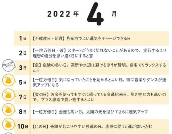 「ということは、このリストの通りに行動すれば金運が上がるのね!」と思いたいところですが、大事なのは自分の気持ち。気分が乗らないのに「やれと書いてあるからやるか……」とか、金運が良くない日に予定が入って「運が下がったらどうしよう」などと後ろ向きな気持ちになってしまうと、良い日でも運気はダウンしてしまうそう。
