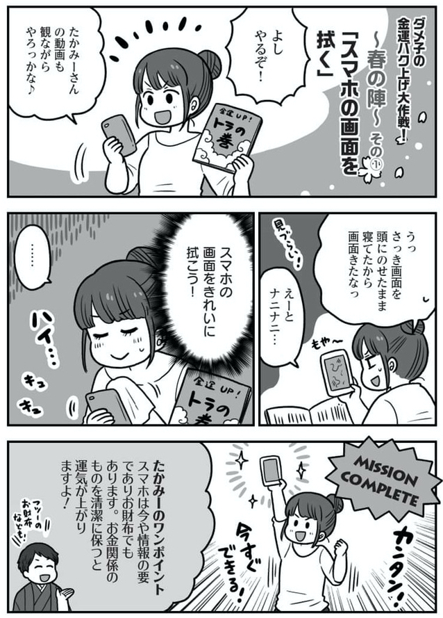 そのスマホの画面、今すぐに綺麗に拭きましょう! なぜなら、これが金運アップのテクだから。たかみーさんによると、お金関係の物を清潔に保つと運気が上がるとのこと。今やスマホも電子決済の機能があったり、お金の源である情報の塊だったりと、もはや財布と同じ。もちろん普段使っている財布そのものも、清潔にしておきましょう。