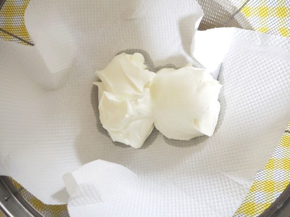 ボウルの上にザルを置き、そこにキッチンペーパーを敷いたら、ヨーグルトを乗せ、フワッとラップをかけて冷蔵庫へ。だいたい、1~2時間ほどで水気が抜けてくるのですが、「ハーベスト」に“塗る”ということなので、ベショベショにならないように半日くらい置いて、よりしっかりと水切りをしてみました。