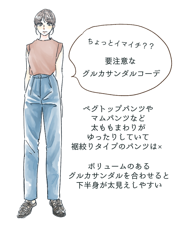 これらのパンツは、太ももまわりがゆったりしているのに対し足首がスッキリ見えることによって気になる太ももやお尻のラインをカバーしながらも美脚に見せるシルエットです。そのため、足元にボリュームのあるサンダルを合わせると下半身に引き締まりが感じられず全体的に太って見えてしまうのです。