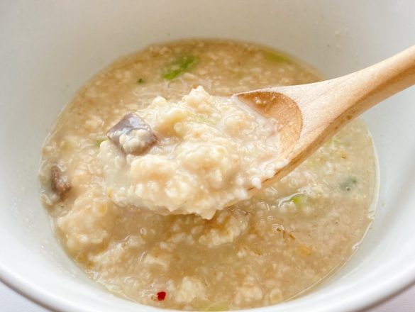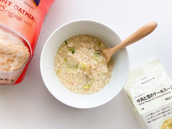 粘り気が少なく粒感が残りやすいタイプのオートミールとあわせるのがおすすめです。粒感が残りにくいオートミールなら、体調崩したときのおかゆ代わりにちょうどいいと感じました。