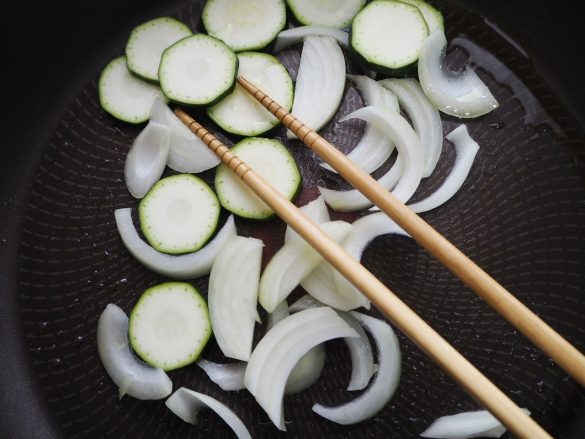 ・玉ねぎ…1/4個 ・ズッキーニ…1/4本 ・オリーブオイル…大さじ1 ・ゆでうどん…1玉 ・酒…大さじ2 ・「素材を生かしたカレー キーマ」…1袋 ・卵黄…1個