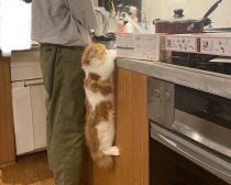 ノワくんは小さなお手手でキッチンにぶら下がり、皿洗い中の飼い主さんにエールを贈ります。