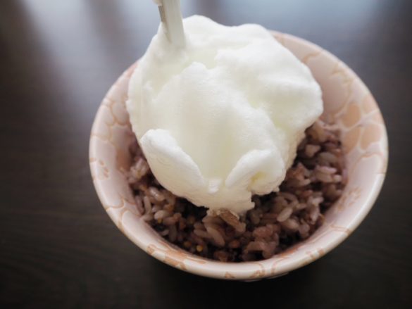 ここまできたら、完成まであと少し。メレンゲをほかほかのご飯の上に乗せます。