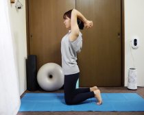 →注意点:右ひじ・左ひじ、両方とも床につけてリラックスし、腕~脇の下、体側の心地よい伸びを感じましょう。反対側も同様におこないます。