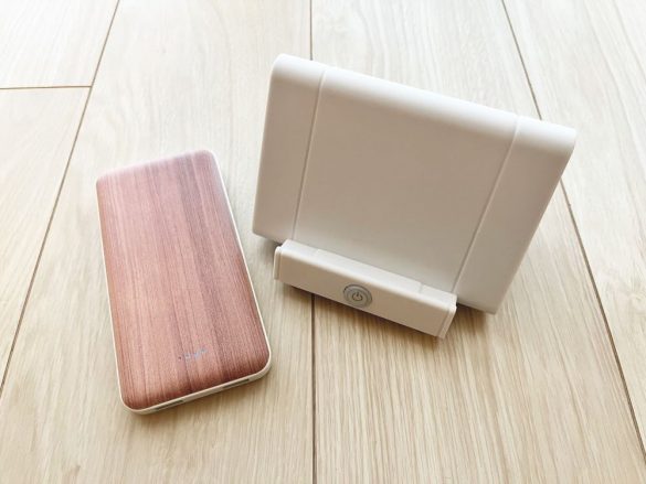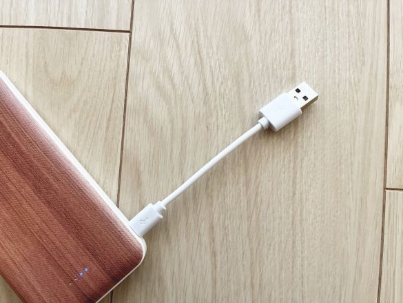 木目調×ホワイトのデザインがスタイリッシュでかわいく、出先で使っていたらさっそく友人にどこの物かをたずねられました。まず10000mAhという大容量のモバイルバッテリーがたった1000円で購入できることが驚きです。筆者が元々使っている同容量のものは3000円ほどなので、相当リーズナブル。
