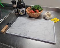 まな板の表裏面がポリプロピレン樹脂で作られていて、白ベースの大理石柄にデザインされています。フチ部分は白色で、全体的に程よくエレガントな雰囲気。