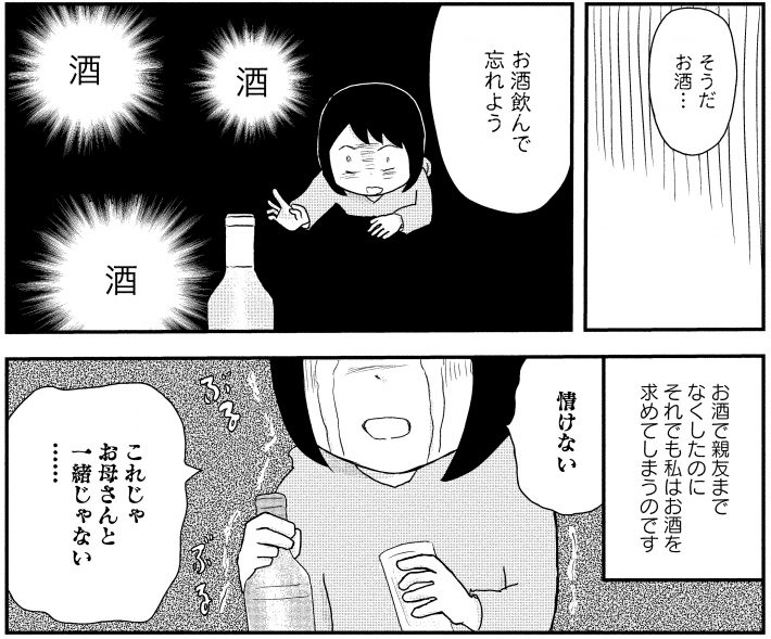 【1話の出張掲載はこちら】⇒お酒で人生が壊れた女性、アルコール依存支援の集まりに参加して号泣のワケ<漫画> トラウマを抱えている人が圧倒的に多い――お母さんも最上さん自身も蝕んだアルコール依存症とは、いったいどのような病気だと思いますか? 最上「段階がある病気ではないかと。アルコール依存症は最終的には脳の病気といわれているんですよ。お酒を飲まなきゃやってられないという精神状態自体に病的なものを感じます。私は依存はしたけど、予備軍でとまっていて、謂わば精神依存の状態。これが脳までいくと、薬物治療も必要になっていきます」 ――どういう人がアルコール依存症になりやすいのでしょうか? 最上「飲むお仕事とか、環境としてお酒を飲まなきゃいけないという物質的な理由で依存症になるパターンもあります。ただ、8~9割は心の隙間がある人でしょうね。トラウマを抱えている人が圧倒的に多い。それでいて、感情を吐き出せる場所がない人が陥りやすいのだと思います