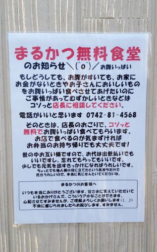 まるかつの店内に貼られたポスターには、「もしどうしても、お腹が空いても、お家にお金がないときやお子さんにおいしいものをお腹いっぱい食べさせてあげたいのにご事情があってむずかしいときなどはコソッと店長に相談してください。(中略)そのときは、店長のおごりで、コソッと無料でお腹いっぱい食べてもらいます」(店内ポスターより)とあり、楽しい口調で無料食堂の告知をしています。