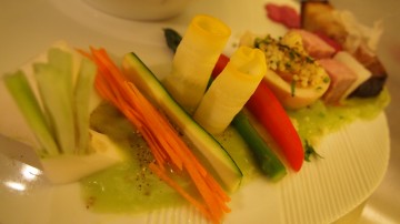 鶏煮干しをベースにした、つけダレに、麺と野菜を絡ませていただきます。まるでバーニャカウダのようです。野菜を「バリバリ」と音をたてて食べることのなんと気持ちいいこと……!