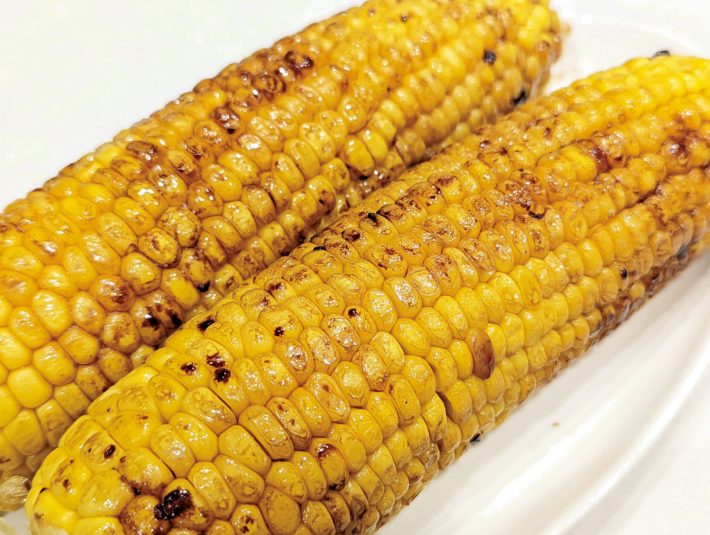 青髪のテツ氏作、焼きトウモロコシ。「旬の食材は味もよいので、シンプルな調理でおいしく食べられる。忙しい人こそ旬のものを!」