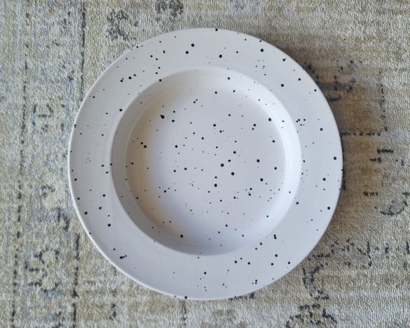 今回の名品は、塗料や絵の具を滴らせたり、たたきつけたりしたような模様「スプラッシュ柄」でシンプルにデザインされたスーププレートです。価格は、1枚550円(税込)。  はじめにお伝えしておくと、SNSで話題になっている影響なのか完売のお店も出ているようです。実は私、同柄のスープ器が気になっていて、翌日に再訪したところ売り切れという体験をしています。