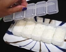 容器を裏返して、底を押してにぎり寿司を取り出します。底部分にはシャリを1つずつ取り出しやすいように押し出せるようになっているので、簡単にシャリが取り出せる工夫がしてあるのでコツが必要ないのも嬉しいです。