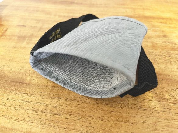 内側がパイル地になっていて水滴を軽減。持ち手サイドのタグがシンプルなデザインのアクセントになっています。
