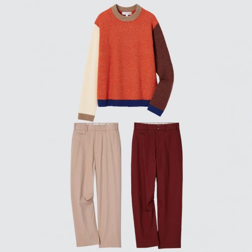 このコーデのポイントは、「カラーブロッククルーセーター」袖のブラウンと、「ソフトチノワイドパンツ」のブラウンを掛けて合わせた配色です。