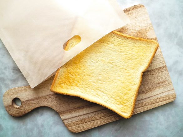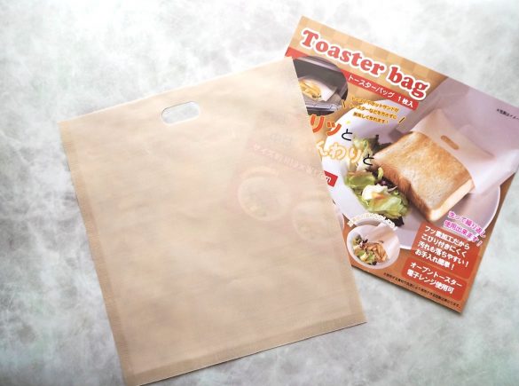 「トースターバッグ」は、縦19センチ、横17センチのほぼ真四角に近い形をした“袋”。フッ素加工により、さわるとツルツルとしているほかは、何の変哲もないただの袋に見えるのですが、実はこれ、トーストを美味しく焼き上げる魔法の袋らしいのです。