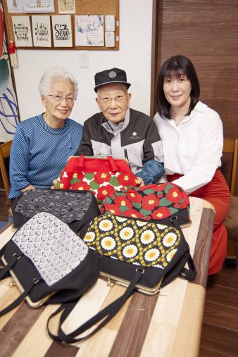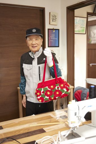 赤い椿の柄が目を引く、ちょっとレトロながま口バッグ。作ったのは現在84歳のおじいちゃん。『あちこちガタが来てるけど心は元気!80代で見つけた生きる幸せ』(KADOKAWA)の主人公です。