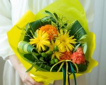ブーケを構成する黄色いガーベラの花言葉は「希望」、オリーブの木の花言葉は「平和」。大切な人にプレゼントするもよし、自分のお部屋に飾るもよし。