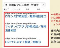 知人に弁護士がいないからとネットで「国際ロマンス詐欺 弁護士」などと検索して弁護士を探すケースが多いようですが、そうした探し方をするのには危険が伴います。検索キーワードに連動して表示されるリスティング広告を「検索上位」と思い込んでクリックし、そのまま依頼、しかし広告に書いてある通りの成果が得られない…ということもあるそうです。
