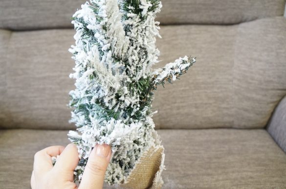 付属の取扱説明書を見ながらツリーを飾っていきます。まずは束になっている枝を支柱から離すようにバランスよく広げていきましょう。壁側には広げず、片面にだけ広げるのがポイント。  開封から広げていくまでの過程で雪の粉がめちゃくちゃこぼれます。あまり乱暴に使うと簡単に枝からはがれてしまうので、優しく広げてあげてくださいね。
