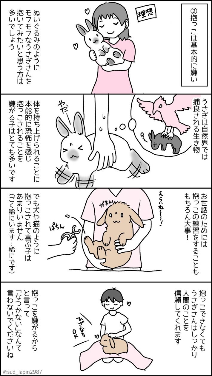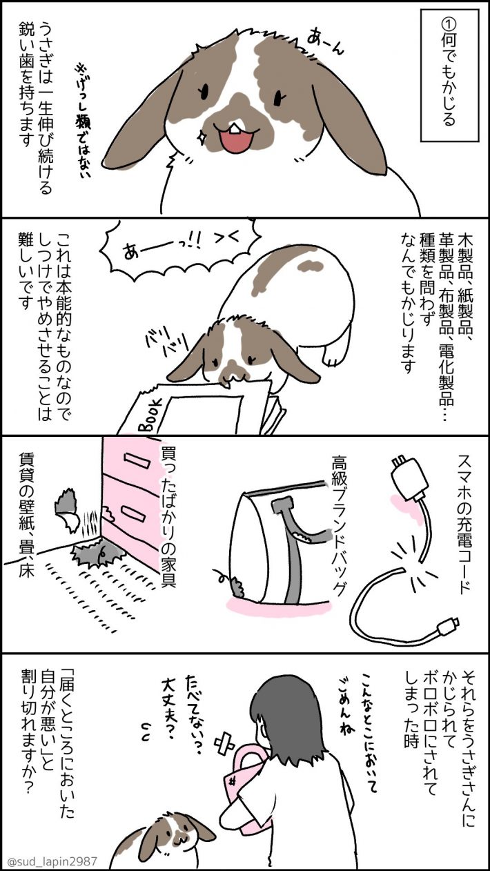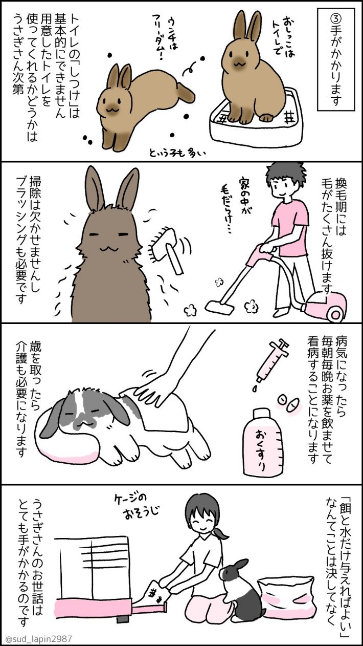 「来年うさぎ年だし、うさぎ可愛いし、最近人気で飼いやすいって聞くし、うさぎさんお迎えしてみようかな~」と思った方に知っておいてほしいこと、というタイトルのもとうさぎを長年飼っている南兎(@sud_lapin2987)さんがTwitterにUPした漫画が話題になっています。  ただただかわいいうさぎですが、南兎さんの漫画を読むと「うさぎを飼うのってこんなに大変なの!?」と驚きます。そこで今回は南兎さんにうさぎとの生活についてお聞きしました。