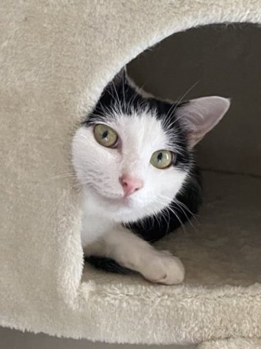 お迎えしたばかりの頃は警戒していたため、猫の入れる棚やキャットタワーのハウスなど、人の目に触れない隠れ場所を部屋に用意し、心をケア。名前は、サザンオールスターズのアルバム「タイニイ・バブルス」のタイトルから付けました。
