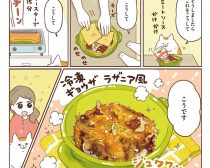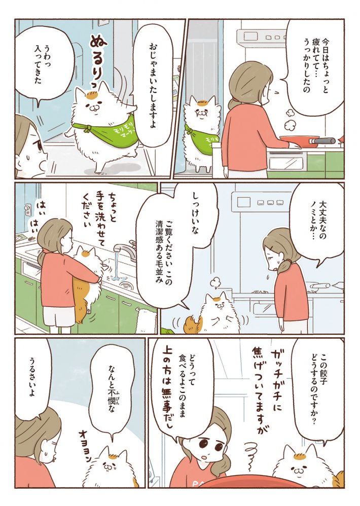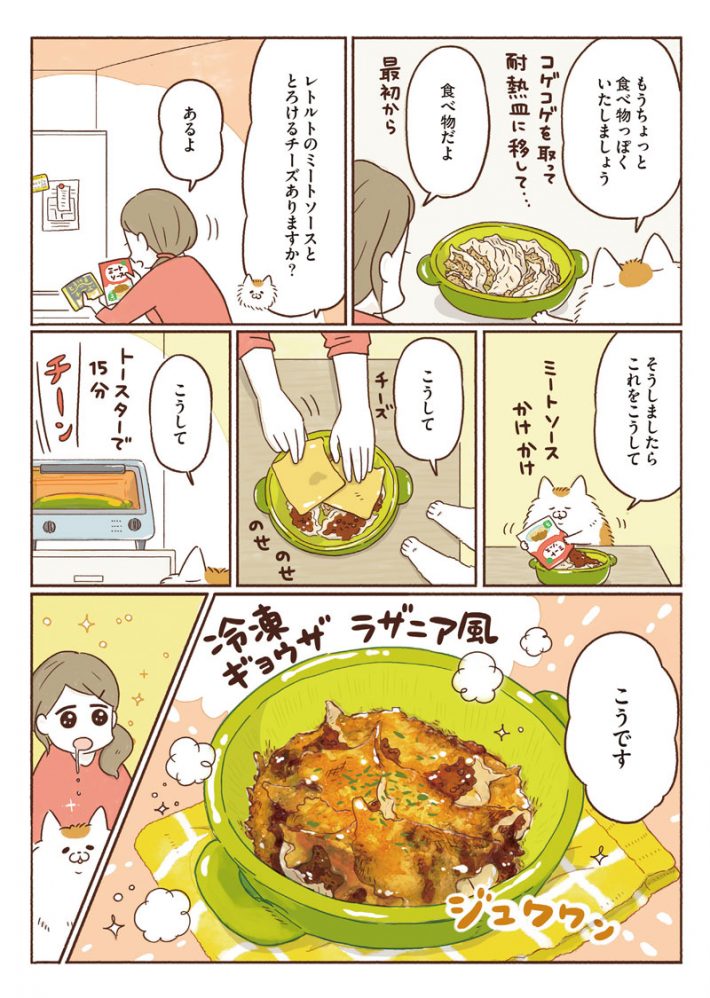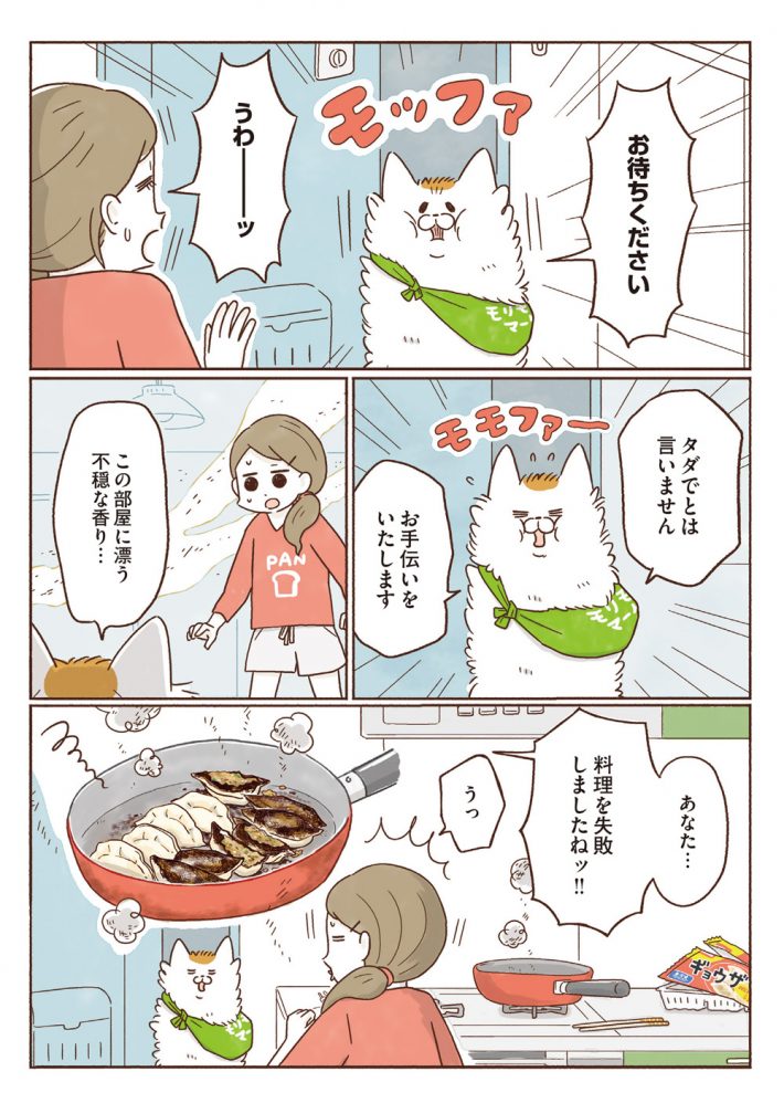 主人公のモモはお疲れ気味で、夕食用の餃子も焦がしていました。しゃべる猫に疑問を抱きつつも、猫を家に招き入れます。するとどうでしょう、猫が失敗した餃子のアレンジメニューをおしえてくれるではないですか。こうして行き場を失った猫のネコ助と、料理が苦手なモモはルームメイトになるのです。本書から4話までを出張掲載しちゃいます!