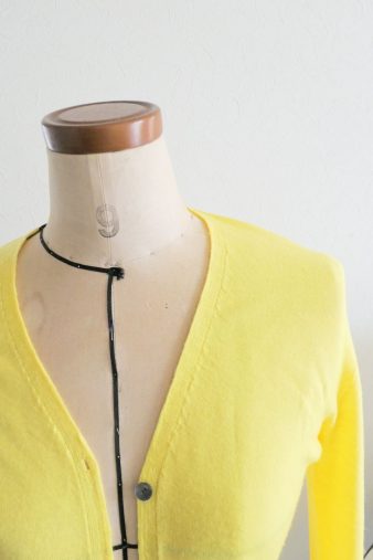 カーディガンと聞くと、どこかノスタルジックな響きを感じるのは、それが小さいころによく大人によって着せられたものだからでしょうか。文化出版局から出ている『ファッション辞典』によると、カーディガンとは「一般的には、毛糸編み、前開き、ボタン留めの上着をさす。Vネック、丸首、衿つきなどデザインはさまざまある」とあります。
