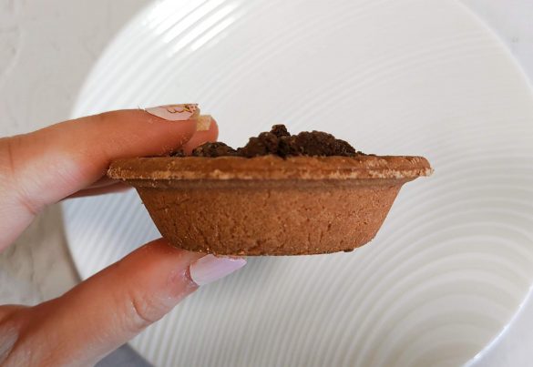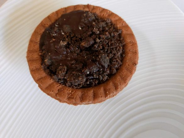 パッケージを開封すると、タルト上部にはチョコレートでコーティングされた砕かれたココアクッキーがありました。