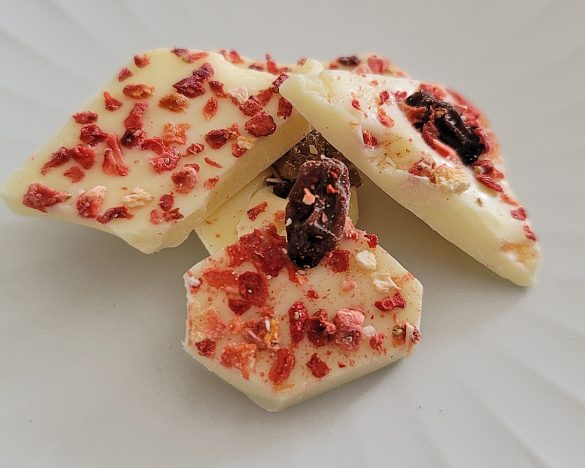 ホワイトチョコにレーズン、ストロベリーダイス、クランベリーが贅沢にトッピングされたビジュアル的にも美しいチョコレートです。
