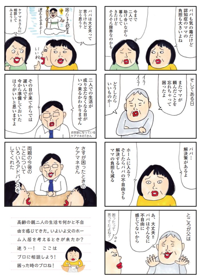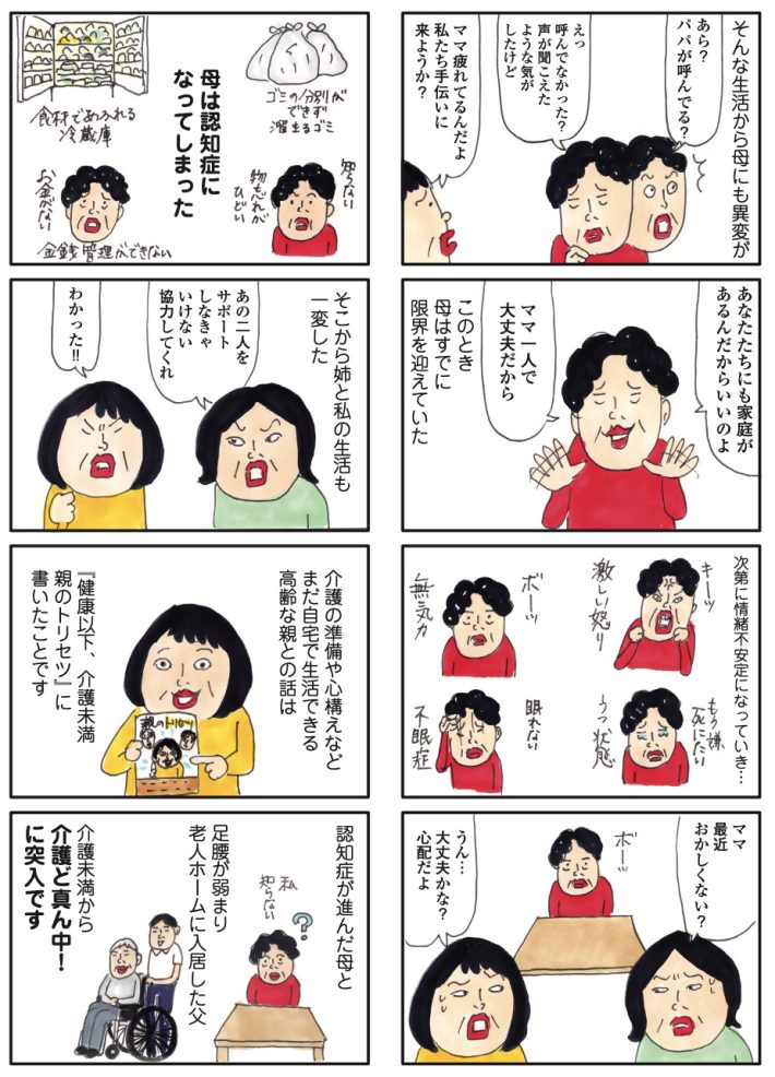 誰にでも訪れる人生の終末期。ついマイナスに捉えがちの親の介護をユーモアたっぷりに語っているのが、『お母さんは認知症、お父さんは老人ホーム 介護ど真ん中!親のトリセツ』(KADOKAWA)です。著者カータンさんは55歳、カータンさんの姉・かおさんは57歳、父・ヒロシさんは85歳、母・イクコさんは82歳。子の世代も人生の折り返しをこえた今、親の介護は体力気力勝負!