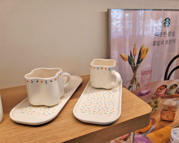 まず大きな違いとして気がついたのは、日本においてはグッズといえばタンブラーやマグカップが大半を占める中で、韓国ではプレートや小皿などの食器類が登場していること。
