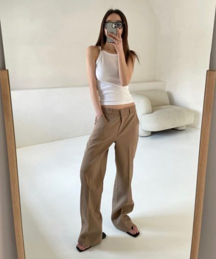 とくにルーズシルエットを採用する場合、トップスはボディラインにフィットするようなサイジングで上下のボリュームにメリハリを作ってください。とくに最近人気の切れ込みが入っているカットアウトトップスはローライズボトムスと相性が良いのでぜひ合わせて一緒に取り入れてみてくださいね。