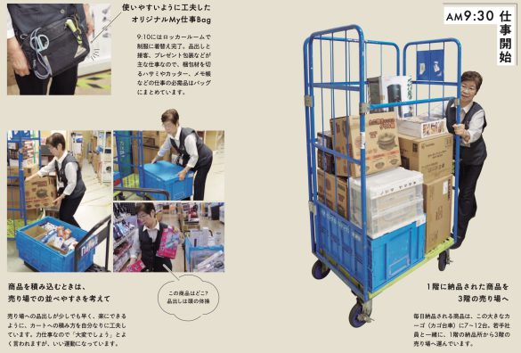 朝一に品出しをしますが、扱っているのは家電。重い、大きい、かさばる……、さまざま難点があります。腰を屈めたり、手を伸ばしたり、全身を使って陳列しなければならず、つい「疲れた」「休みたい」なんてつぶやいてしまいそう。しかしここでも熊谷さんの前向き思考が炸裂。「スポーツクラブへ行って全身運動をしていると思えば、いいのではないでしょうか」。なるほど、お給料をいただきながら健康管理もできるとあっては、率先してやり遂げるぞ、と気合も入りますね。