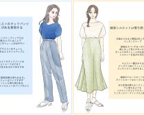 とくに薄くて柔らかい素材、横に広がりすぎない生地の柔らかさは重要です。いっぽうタイトスカートは下半身をすっきりとシャープに見せるため、飾りやデザインが華美なものは避けてシンプルなものを選んでください。
