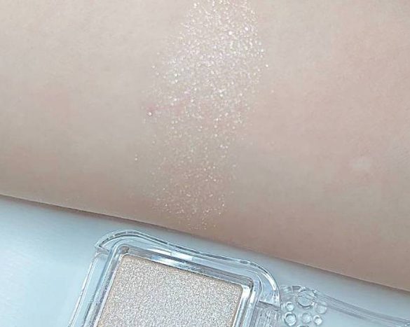 光が当たると繊細な輝きで、多めにつけてもギラつきません。粉質はしっとり、ムラなく伸ばしやすいテクスチャーです。