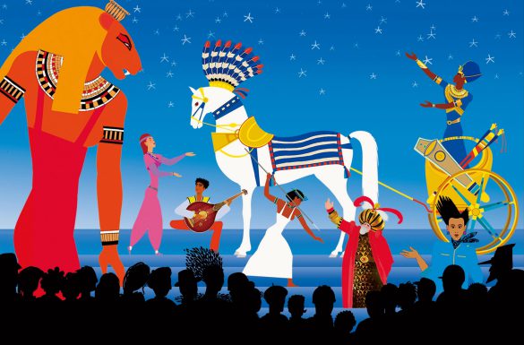各章ごとに手法がちょっと変わっている。恋人との結婚を義母から許してもらうため遠征に出たクシュ王国の王子が、神々の祝福を受けながらその敬虔(けいけん)さによって黒人初のファラオとなる第一章「ファラオ」は、まさに壁画が動いているかのよう。
