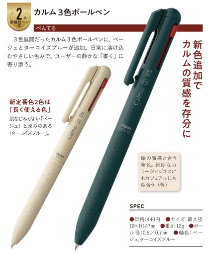 3色展開だったカルム3色ボールペンに、ベージュとターコイズブルーが追加。日常に溶け込むやさしい色みで、ユーザーの静かな「書く」に寄り添う。