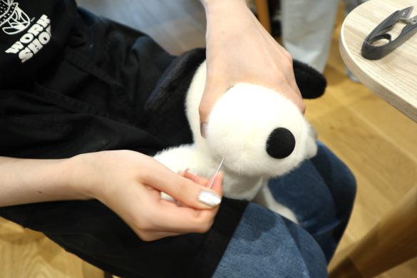 その後、お姉さんは針でスヌーピーの顔をぷすぷす刺し出しました!ちょっとかわいそうな気もしますが、綿の偏りをなくし、ふっくらとさらにかわいいスヌーピーになるためには大切な手順なんです。