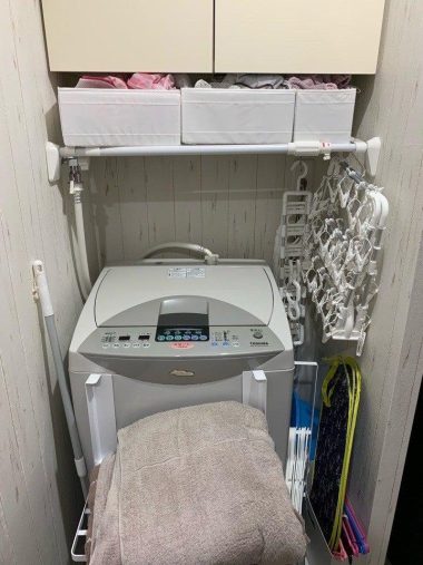 おかげで洗面所、脱衣所、洗濯機置き場はとても狭く、追加で棚などを置くスペースはゼロ。