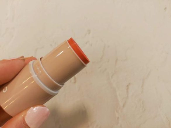 スティックカバーを開けると、美しいコーラル風のカラーをしたスティック部分が登場。今回使用したカラーは、19番「CherryFlambe(チェリーフランベ)」というカラーになります。落ち着いたコーラル風のカラーなので、チーク、口紅、アイシャドウとマルチに使用しやすい色と言えるでしょう。