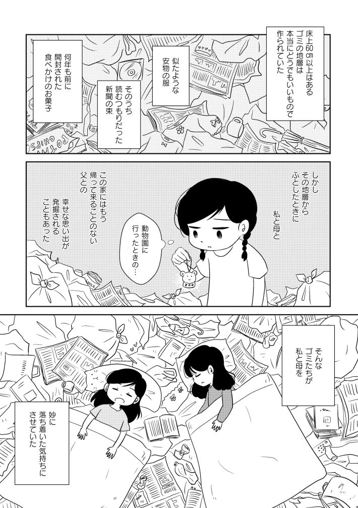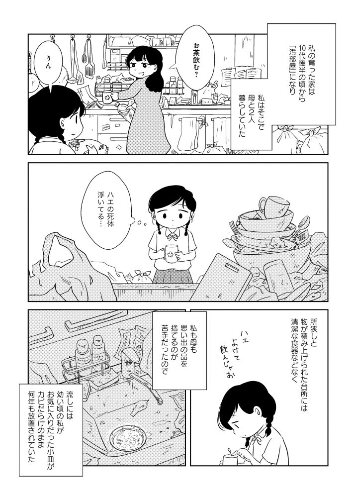 コミックエッセイ『なんで私が不倫の子 汚部屋の理由と東大の意味』(竹書房)では、両親との関係や汚部屋と化した実家で暮らした日々を綴っています。